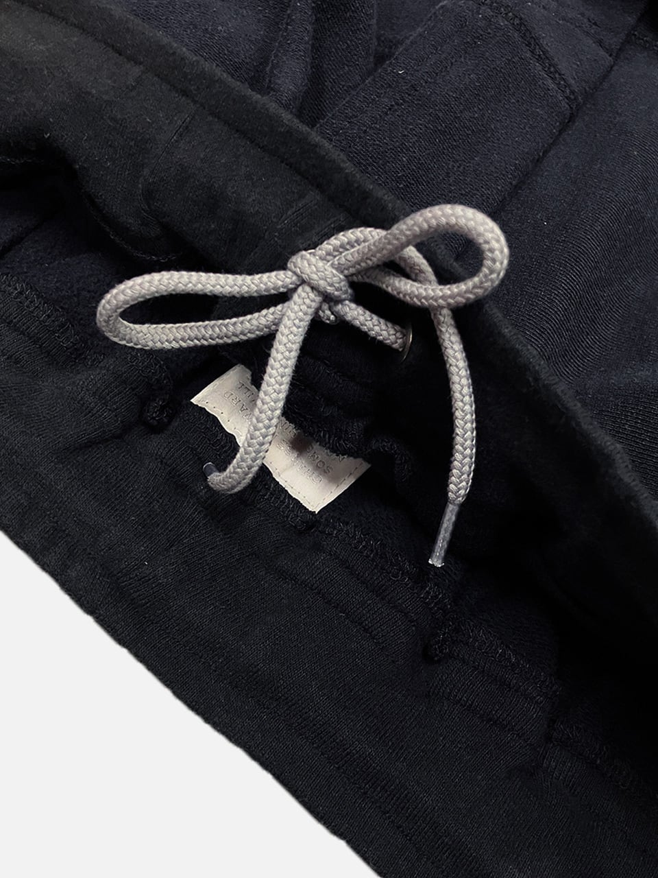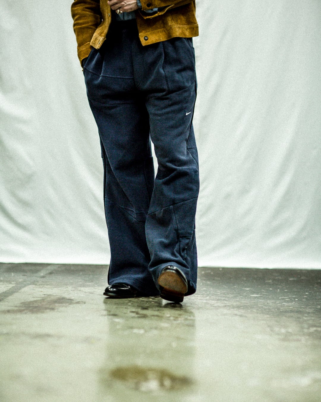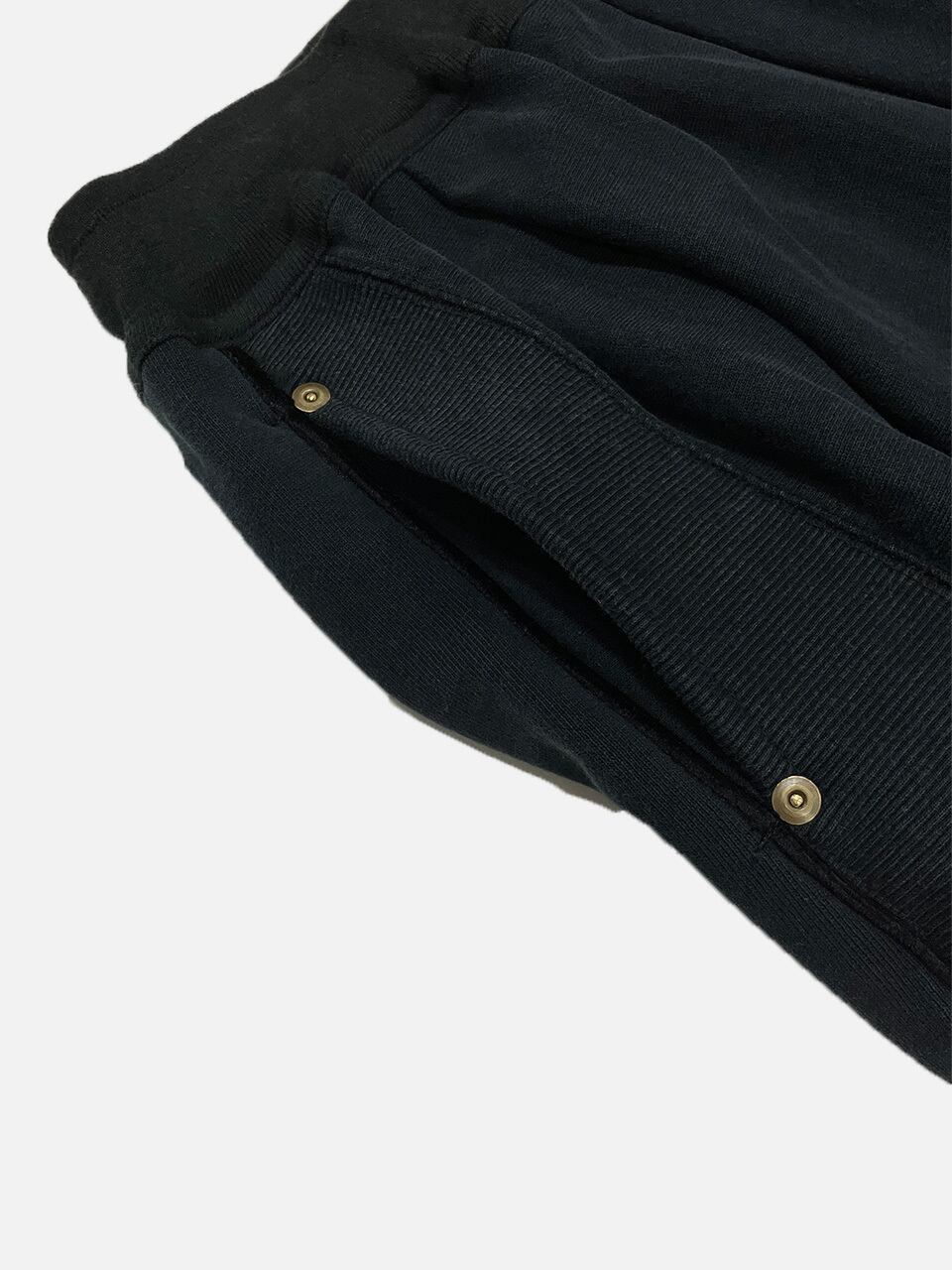 スウェットのフロント刺繍部分をパンツの前・後脇部分に移植して刺繍ロゴが配置されたデザイン