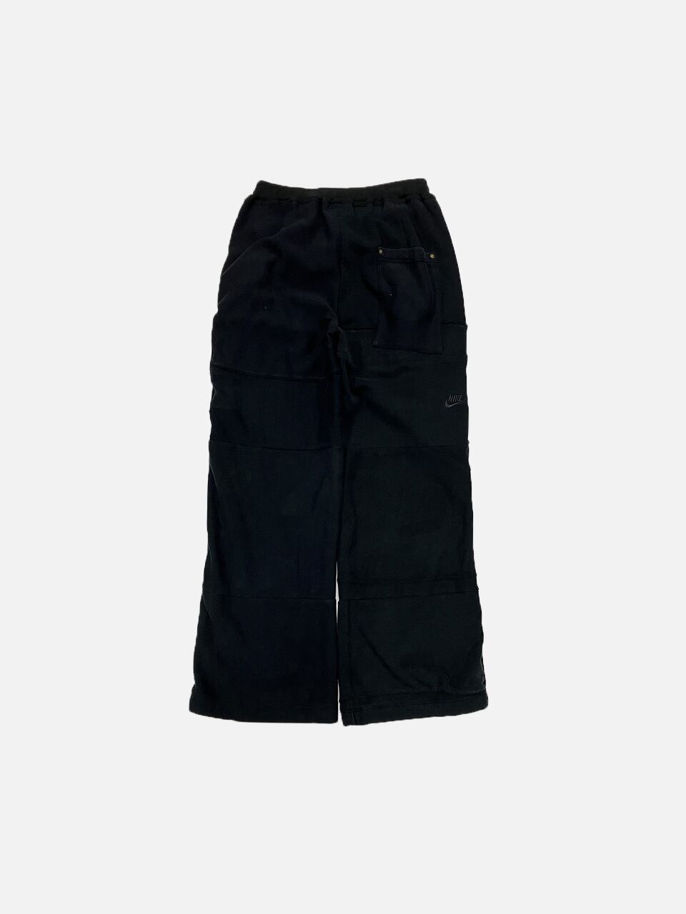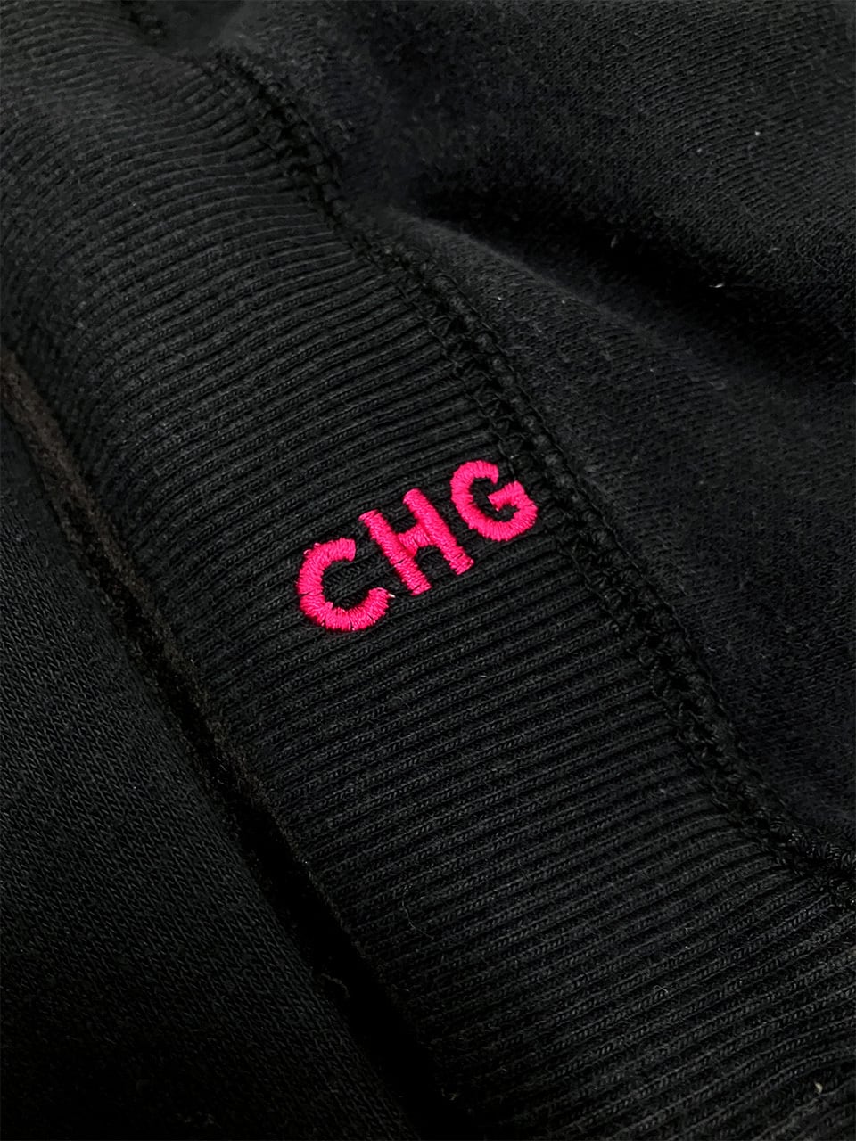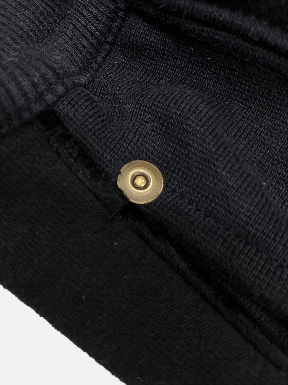 スウェットのフロント刺繍部分をパンツの前・後脇部分に移植して刺繍ロゴが配置されたデザイン