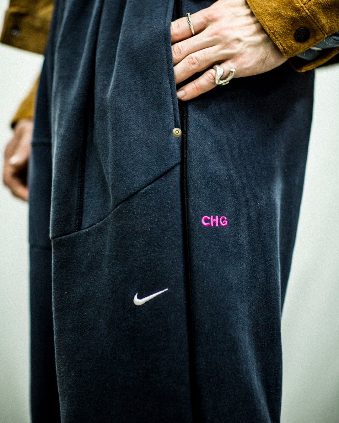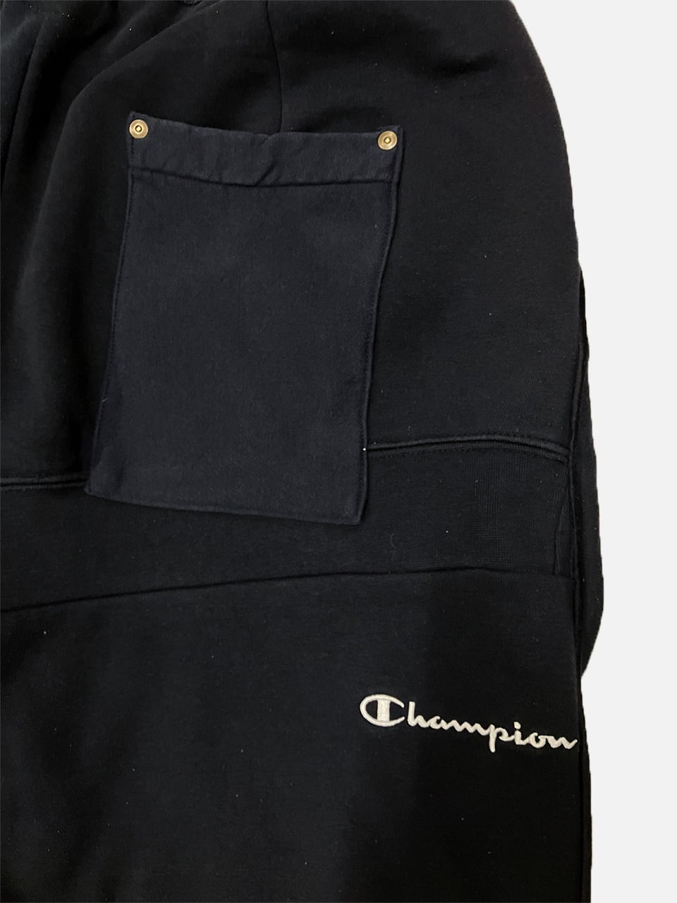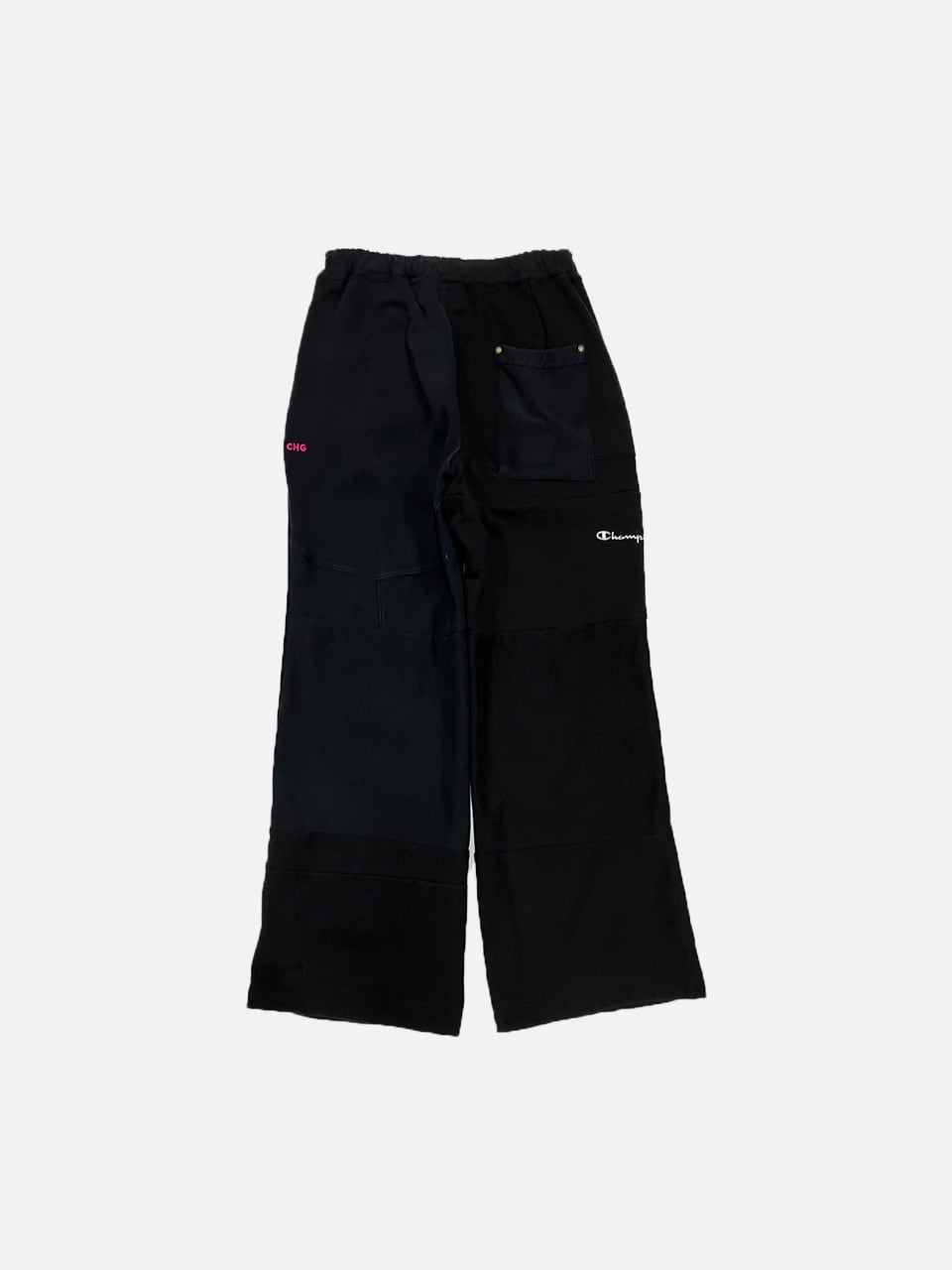 スウェットのフロント刺繍部分をパンツの前・後脇部分に移植して刺繍ロゴが配置されたデザイン