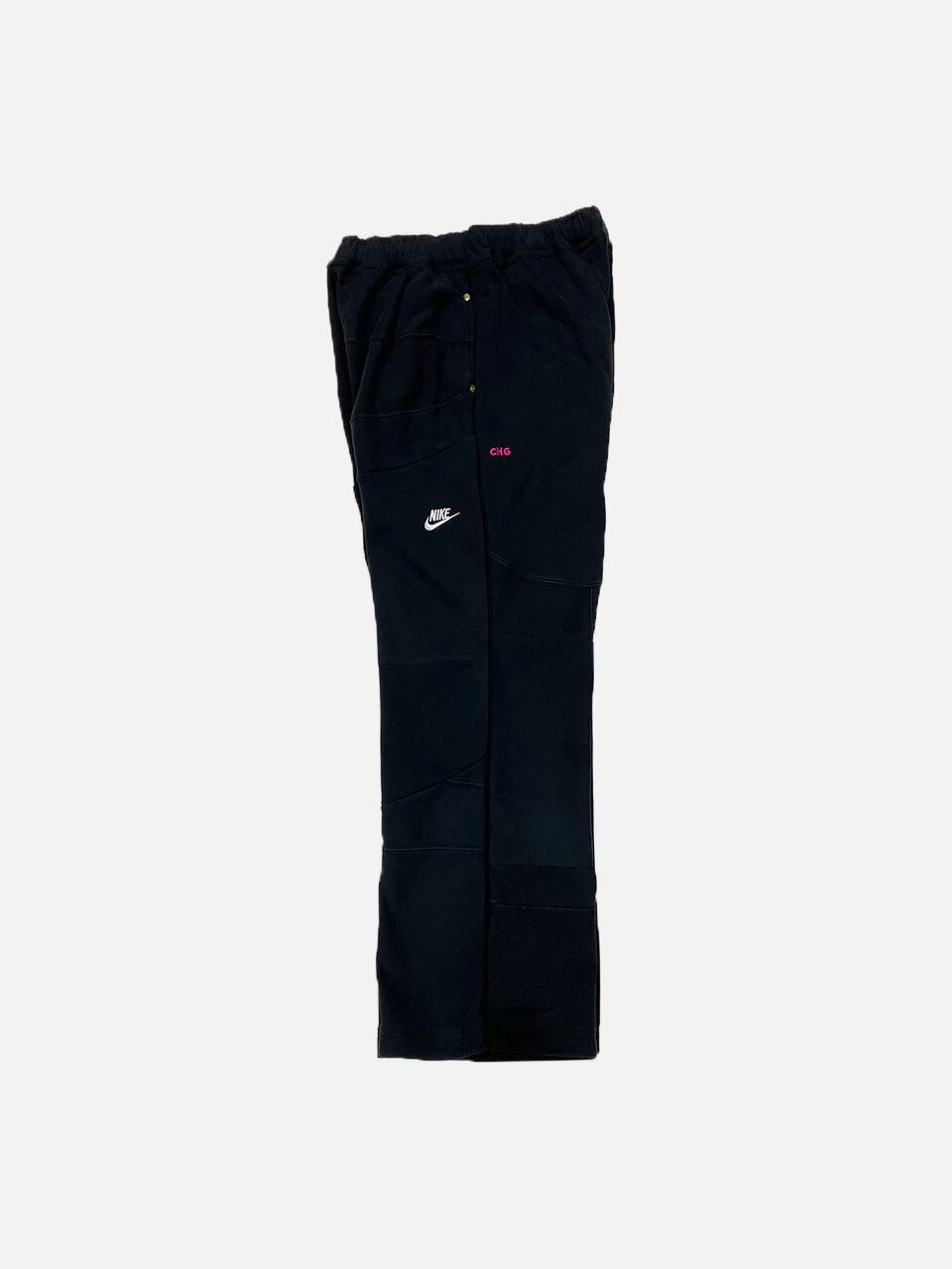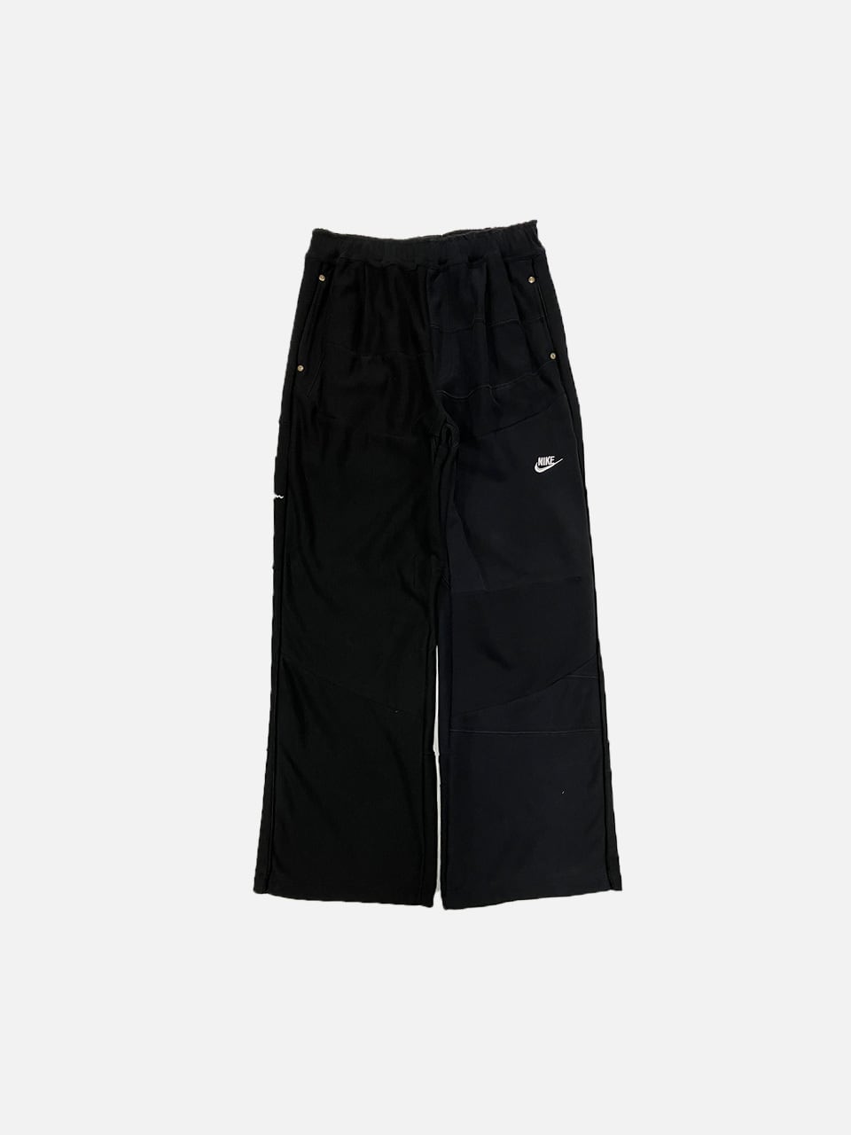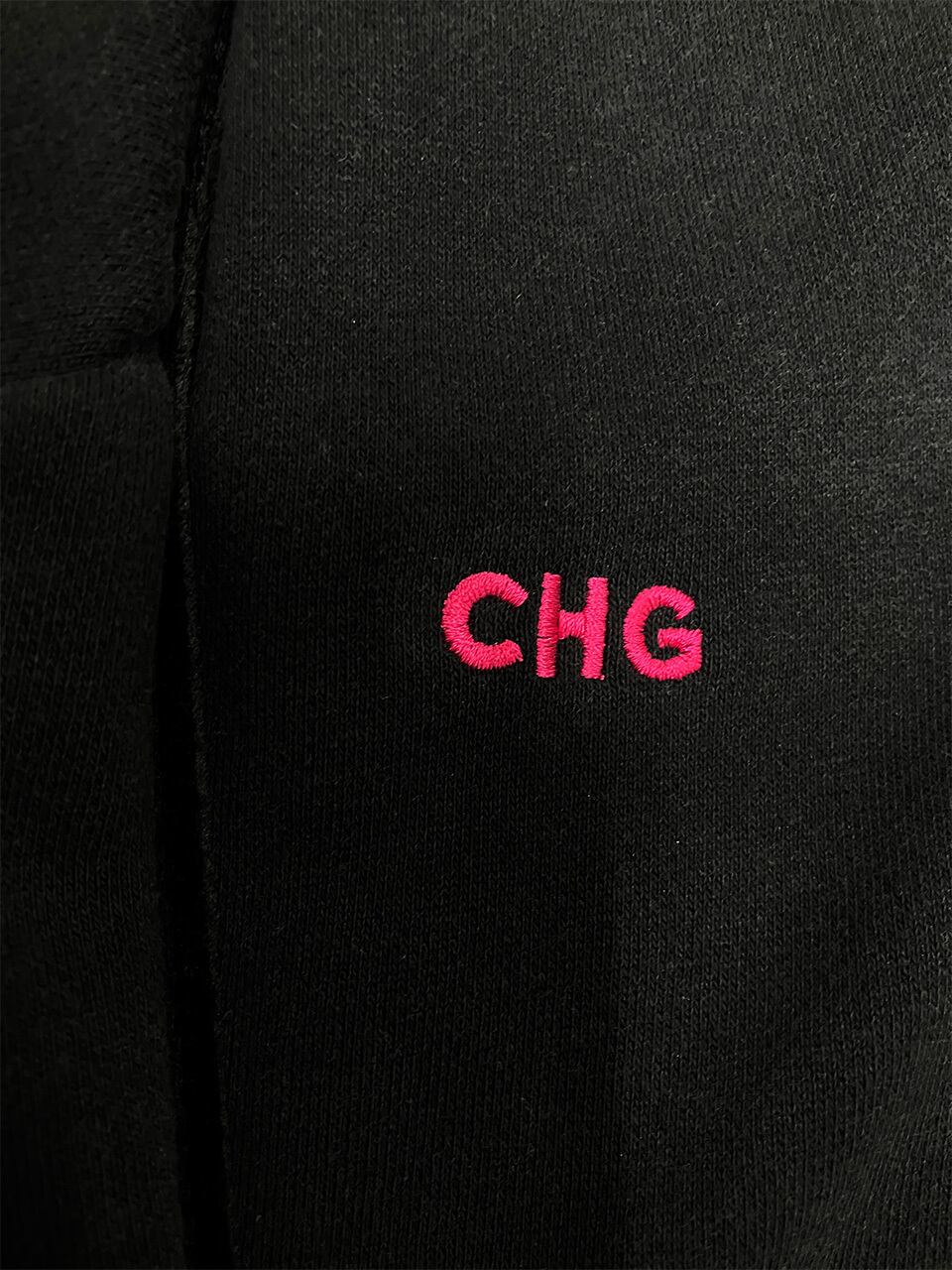 スウェットのフロント刺繍部分をパンツの前・後脇部分に移植して刺繍ロゴが配置されたデザイン