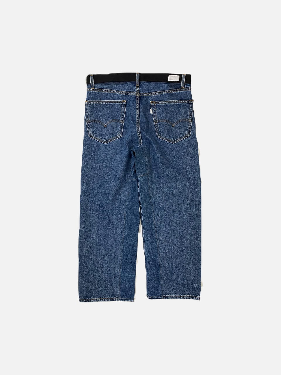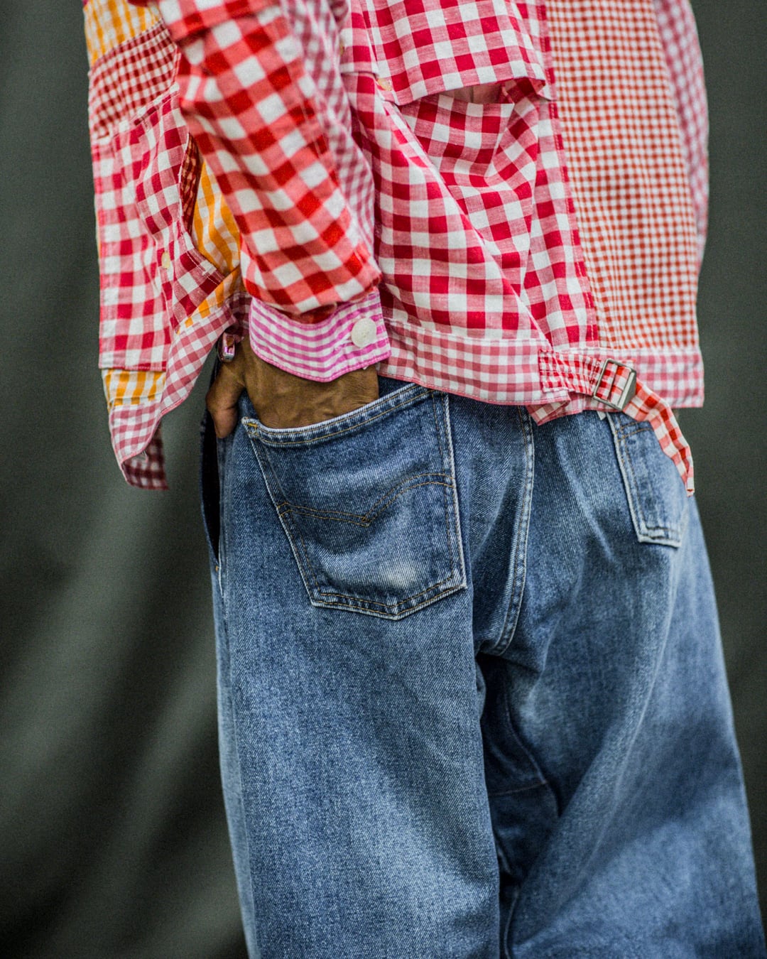 内股に同系色のデニムを足してワイドシルエットにし、裾もアタリを残した切替で
