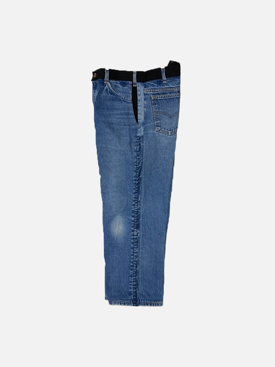 内股に同系色のデニムを足してワイドシルエットにし、裾もアタリを残した切替で