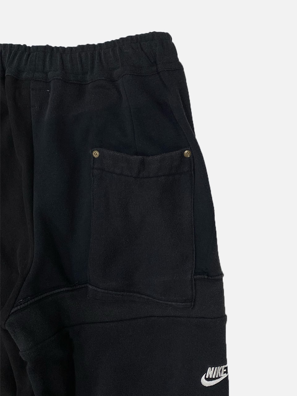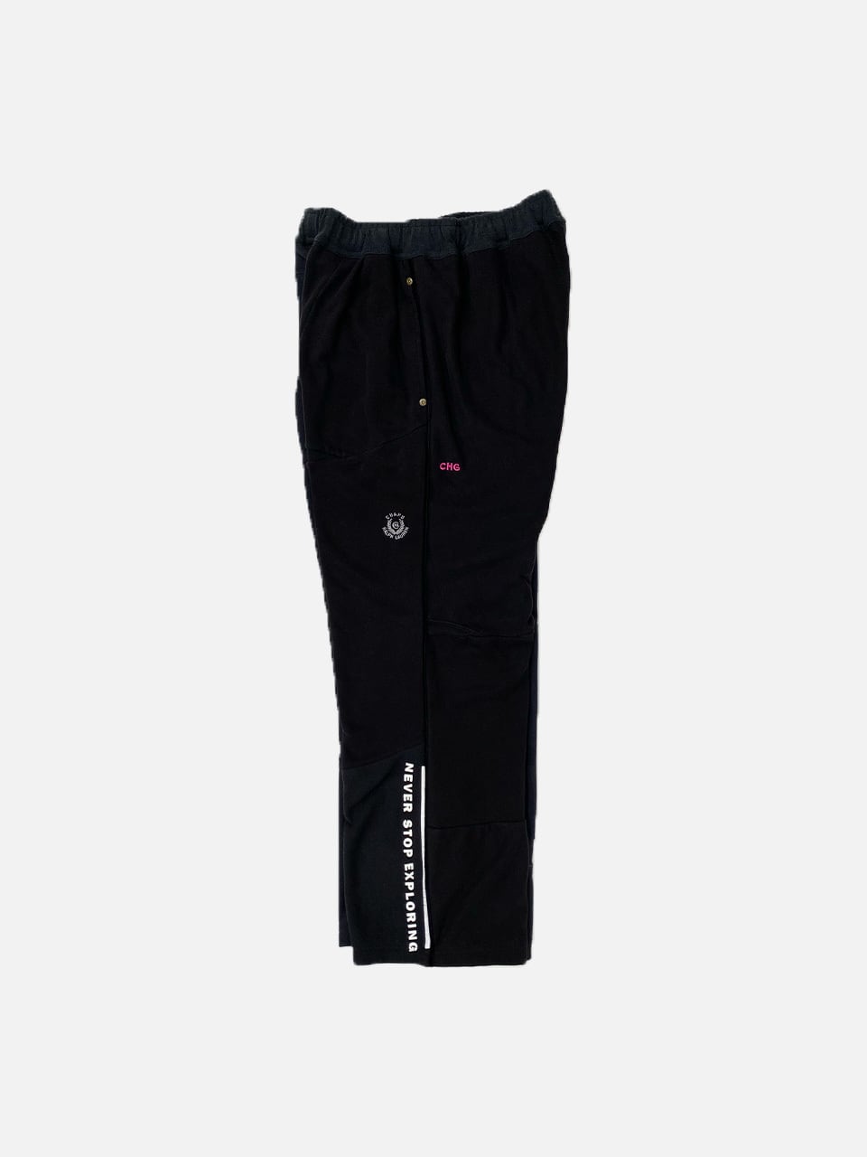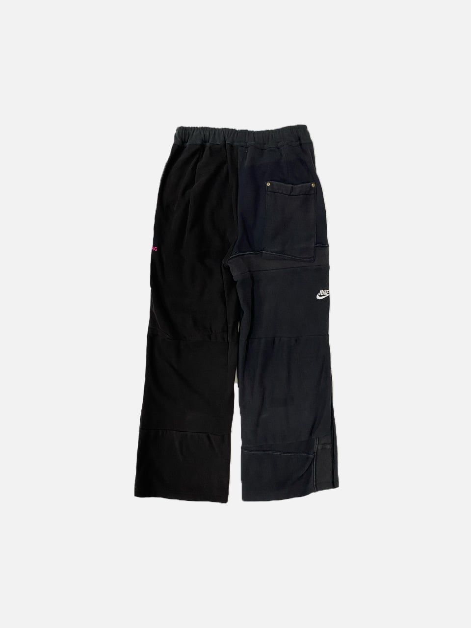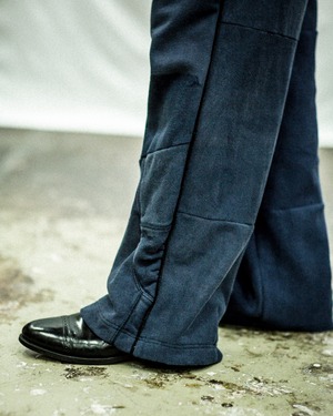 スウェットのフロント刺繍部分をパンツの前・後脇部分に移植して刺繍ロゴが配置されたデザイン