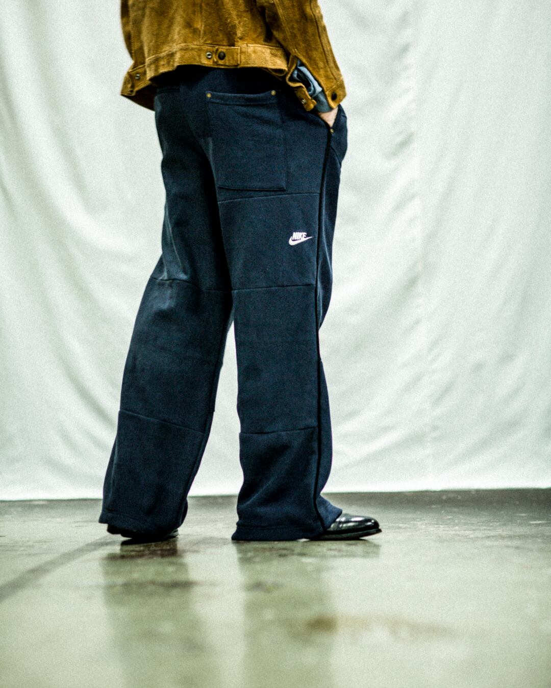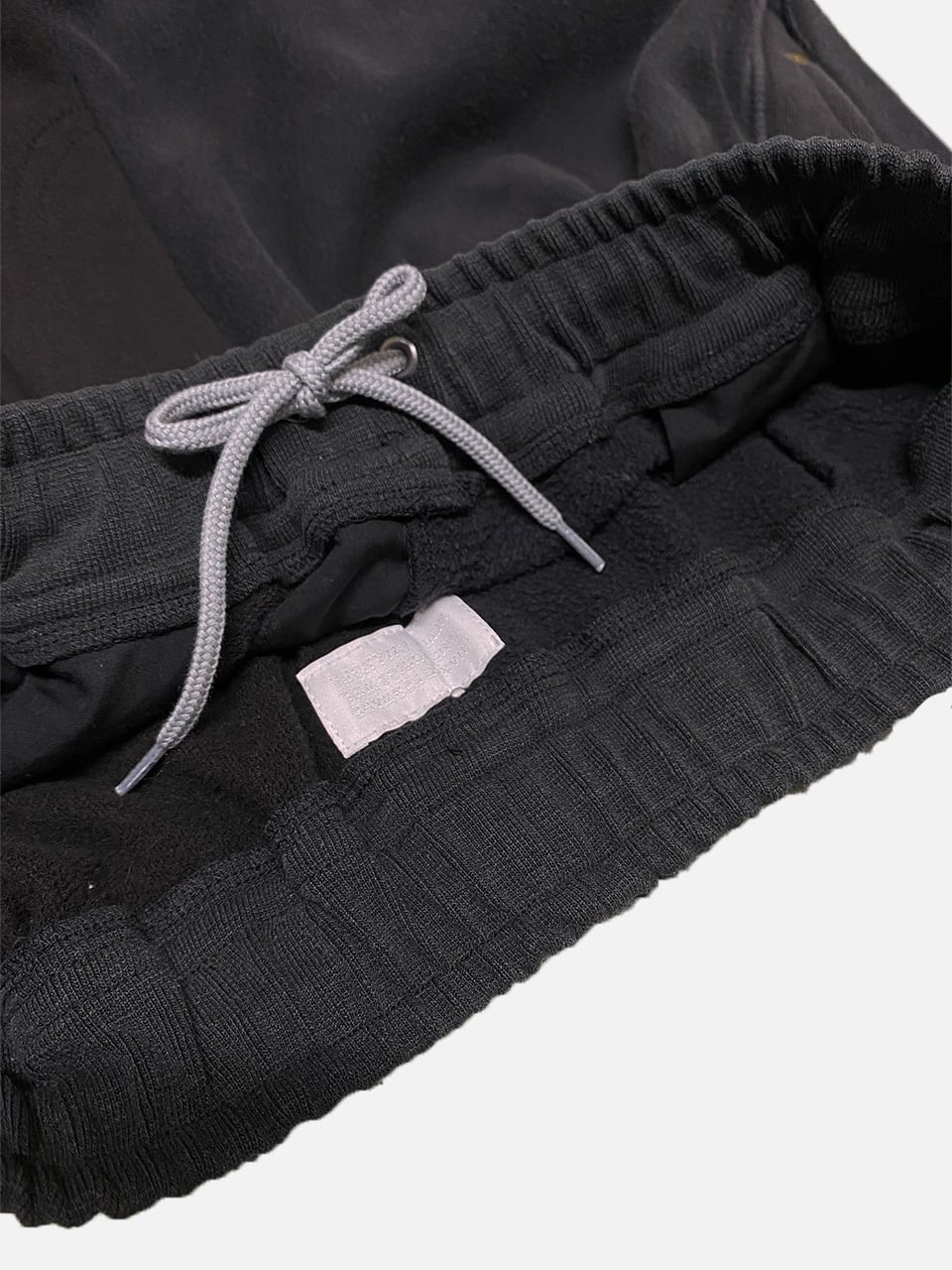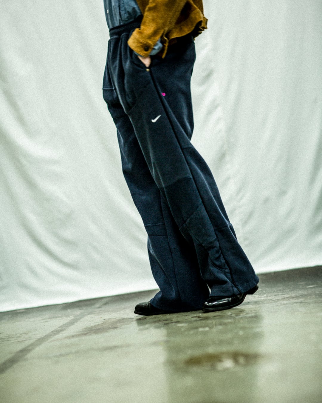 スウェットのフロント刺繍部分をパンツの前・後脇部分に移植して刺繍ロゴが配置されたデザイン