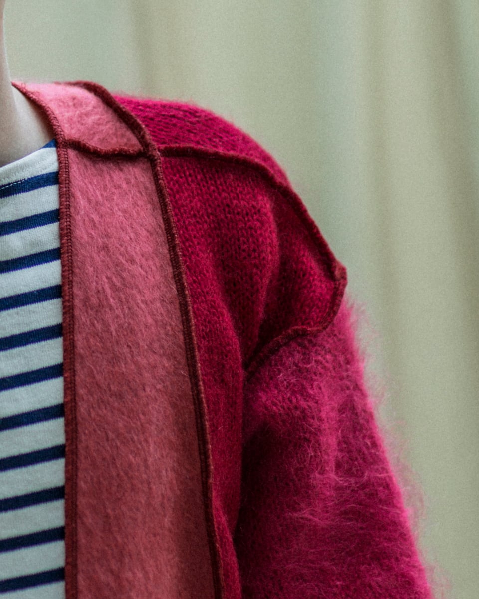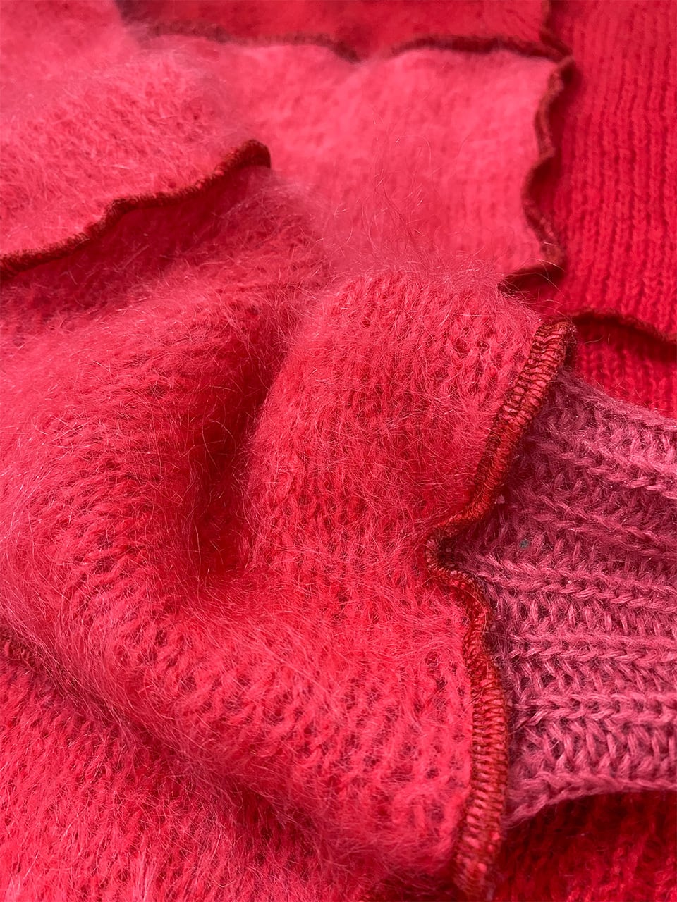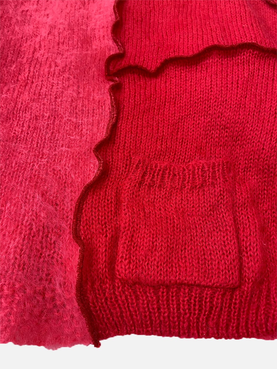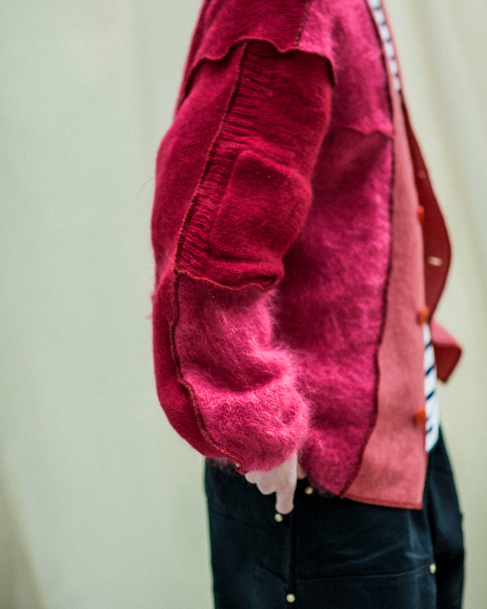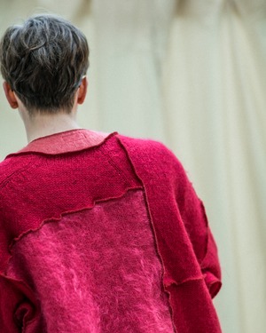 色々な柄,色目のセーターを解体し1点づつ組み合わせています