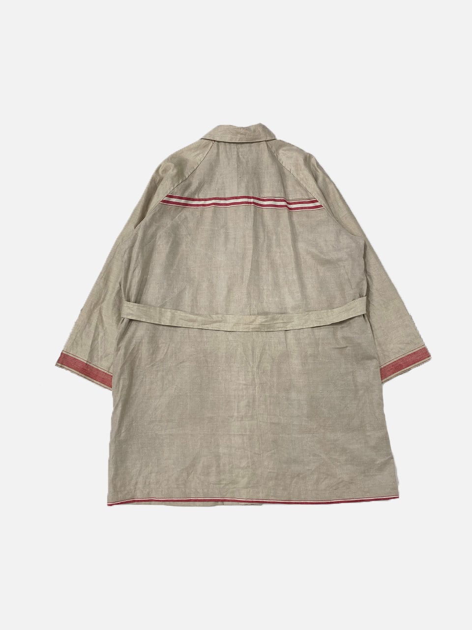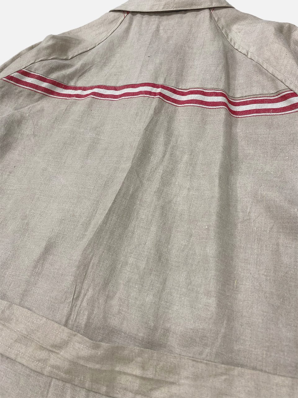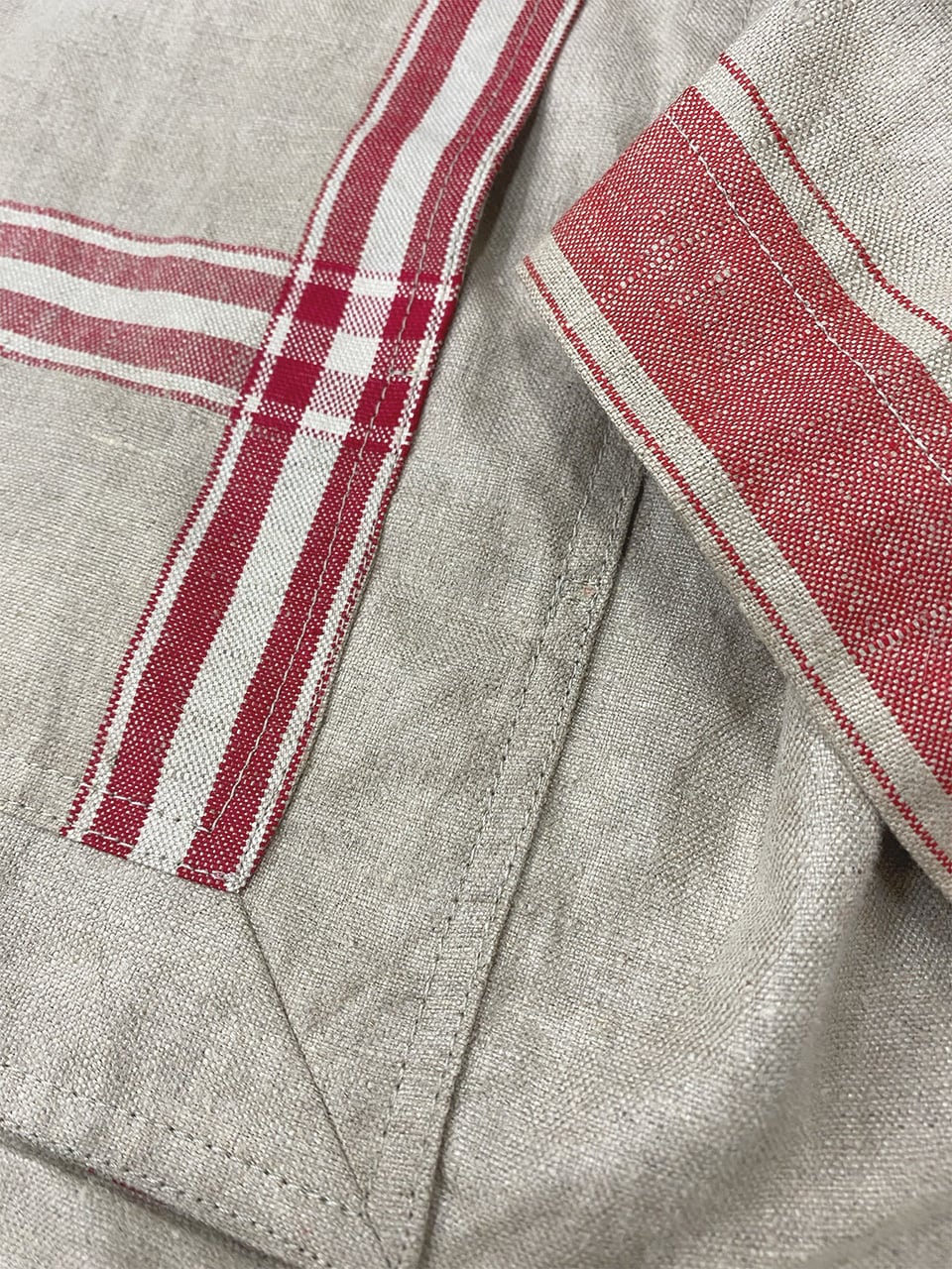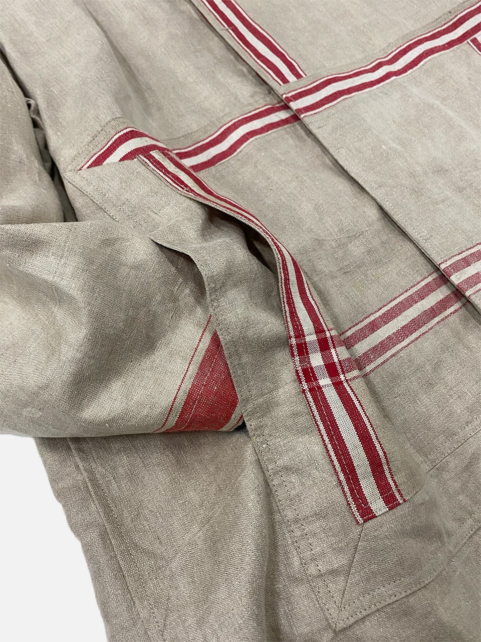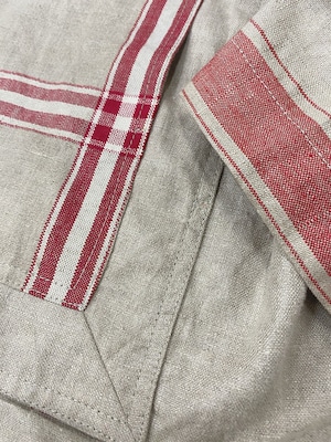 ドイツ製マングルクロス(Mangeltuch)は、ローラー式アイロン(マングル機)の熱や摩擦から衣類を守るための、丈夫なドイツの伝統的なリネン(麻)の当て布で、赤や青などのラインが特徴的、アンティーク市場で人気のリメイク素材としても取引されています。昔は各家庭に一枚あるほど普及し、所有者のイニシャルが刺繍されているものもあり、独特の風合いと歴史的価値があります。