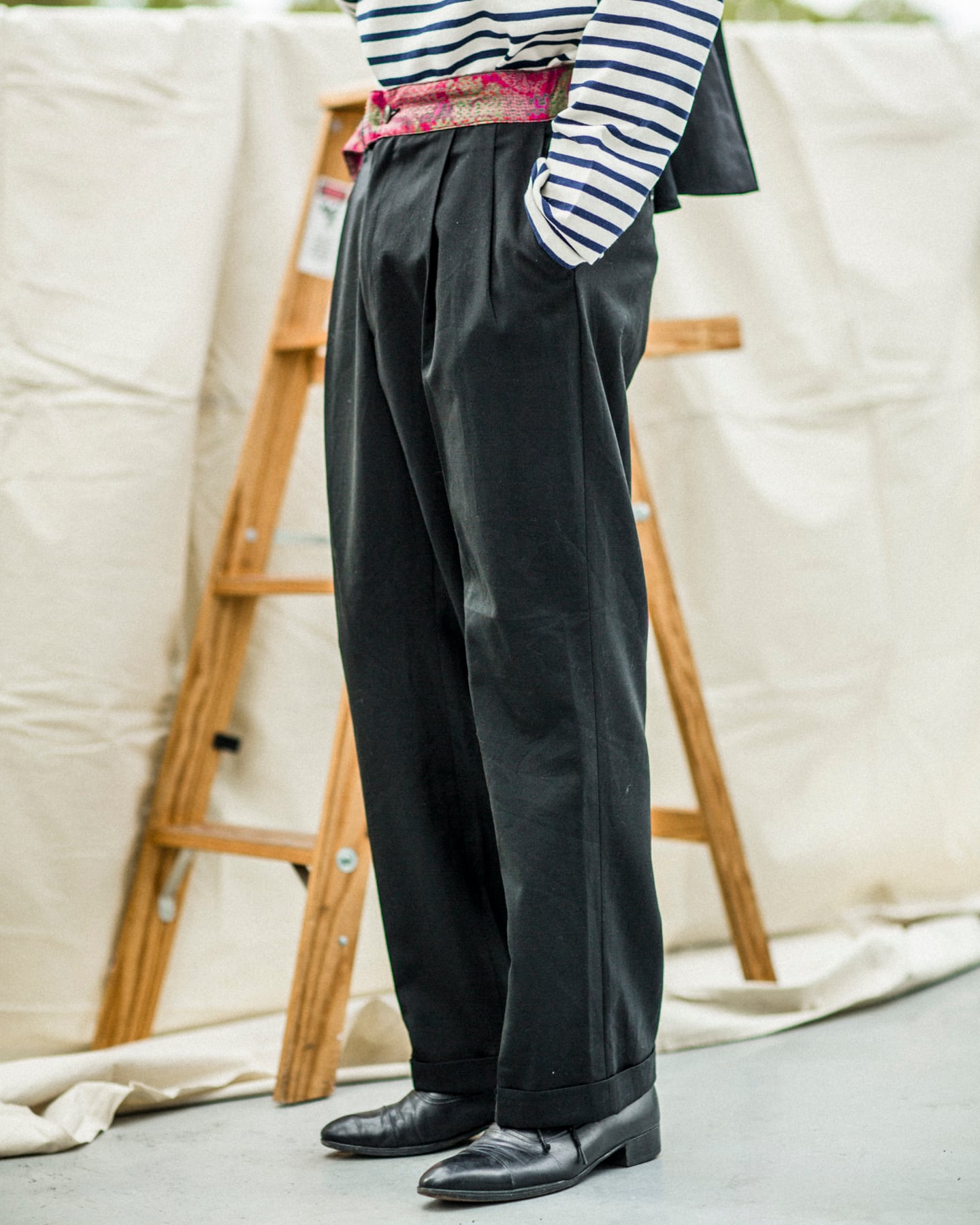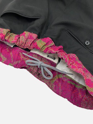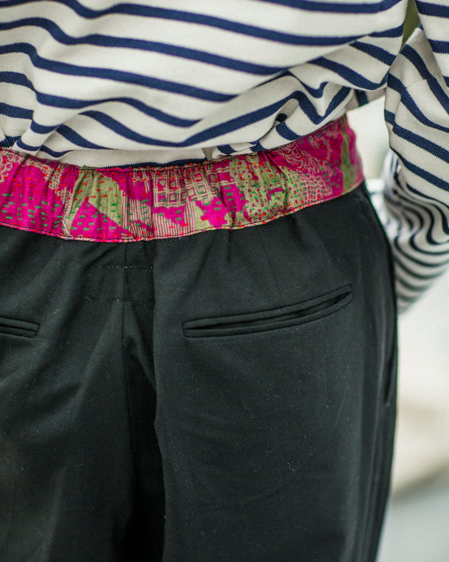ウエスト内側にスピンドルを入れてイージーパンツ仕様になります。