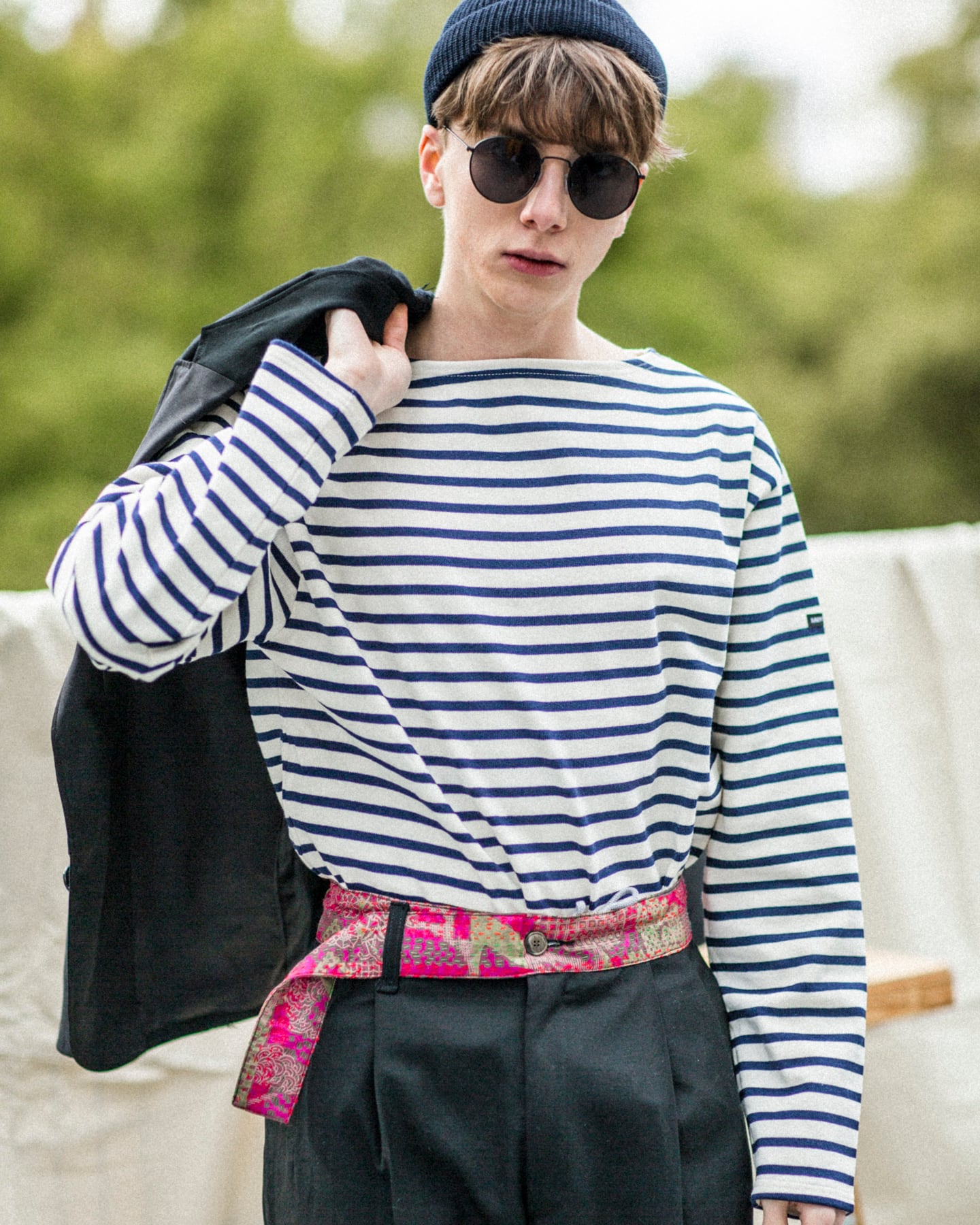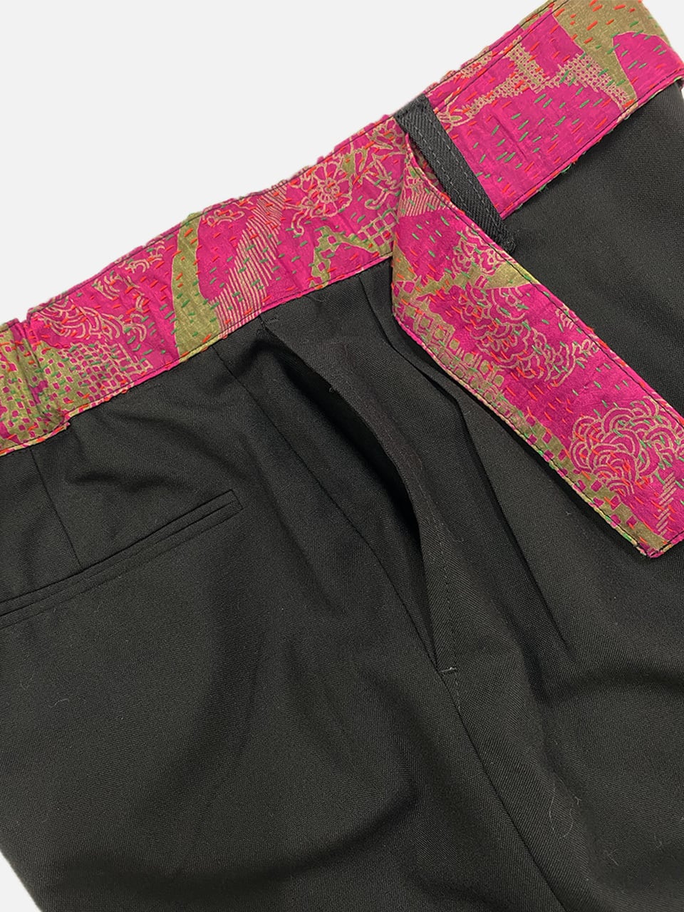 ベルトをシルクの刺し子の生地にて作り、少し長めにしてるので