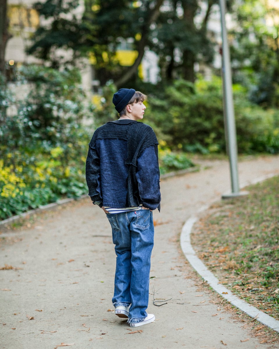 デニムパンツを解体し再構築しています。
