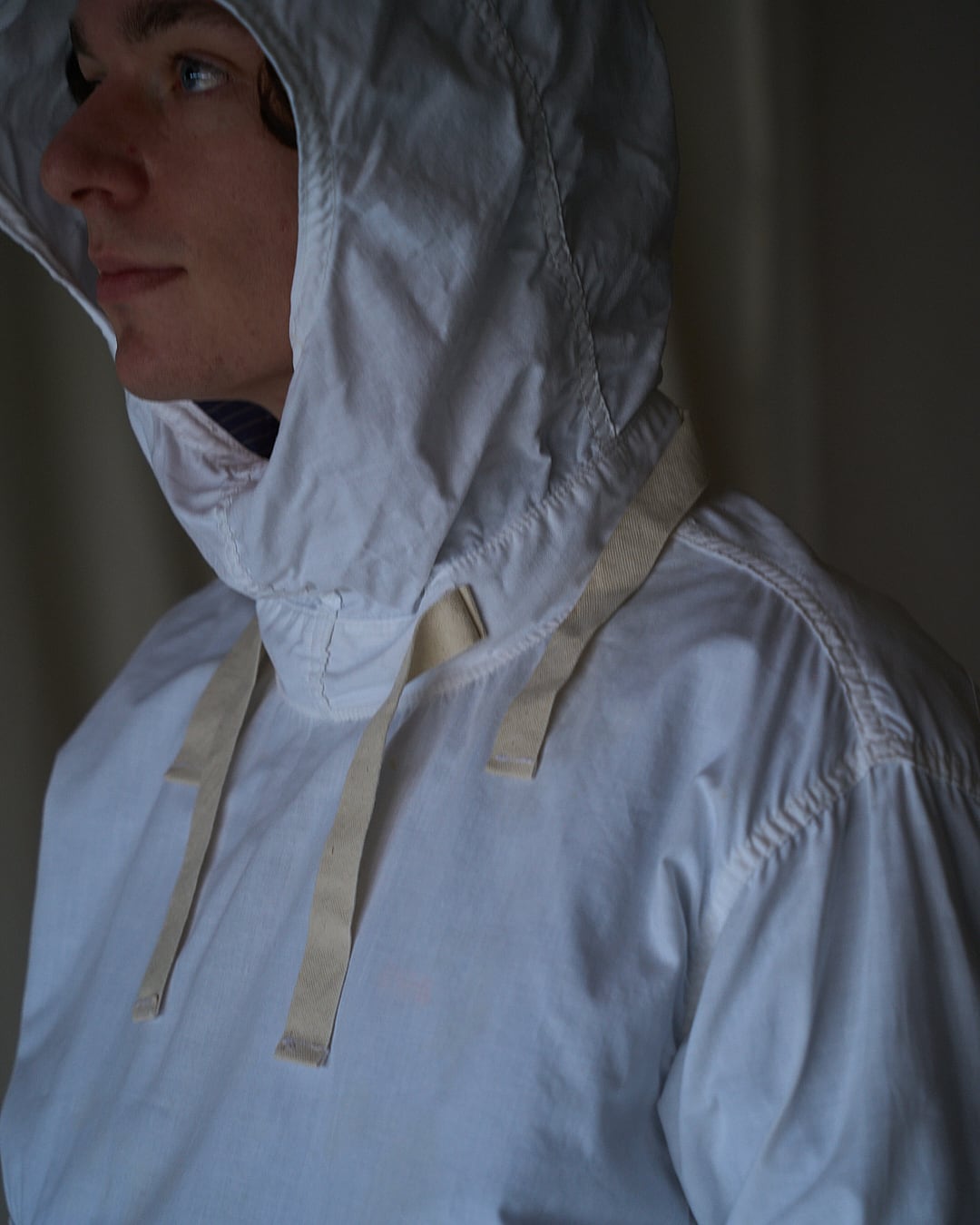 プルオーバーで高いネックとフードが特徴なデザイン