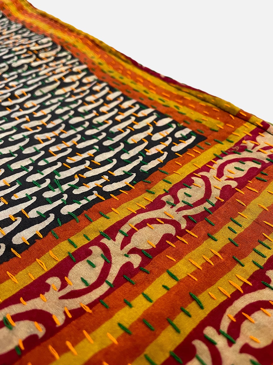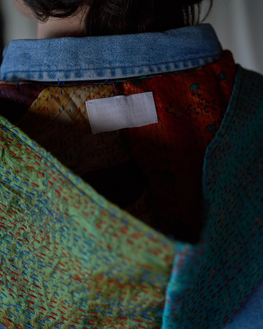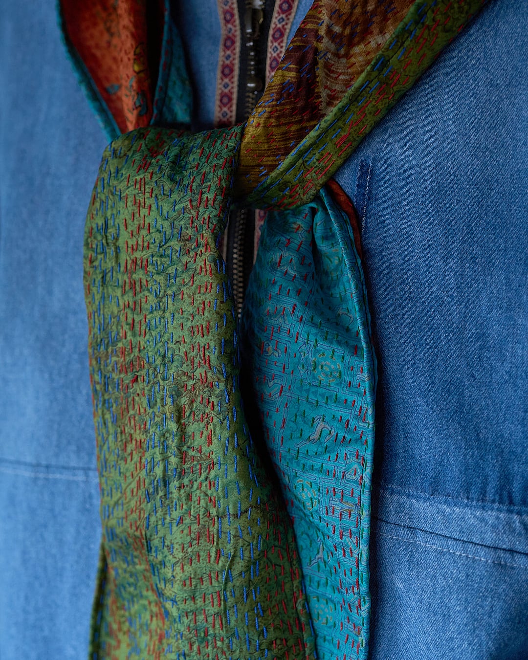 夏はサラッと冬は暖かく2枚の生地を手刺繍にてランニングステッチしています