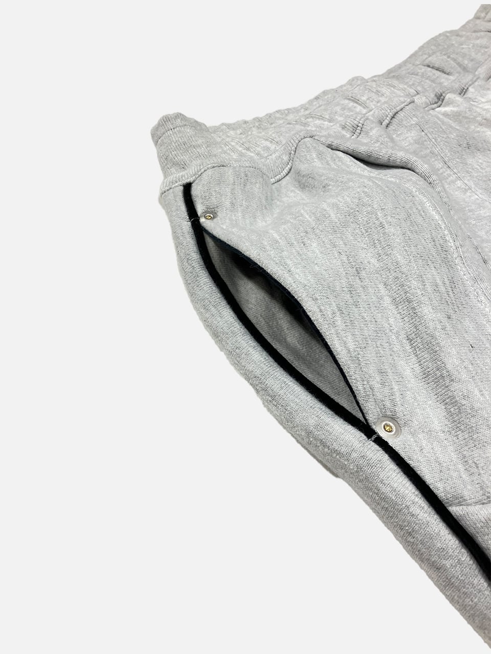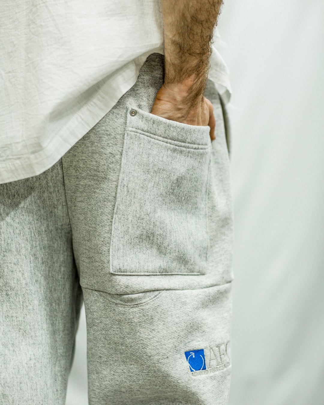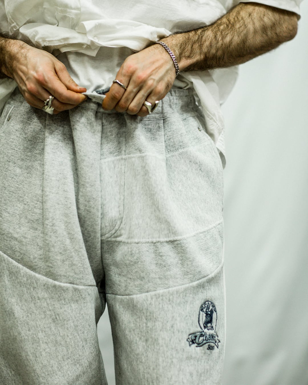 スウェットのフロント刺繍部分をパンツの前・後脇部分に移植して刺繍ロゴが配置されたデザイン