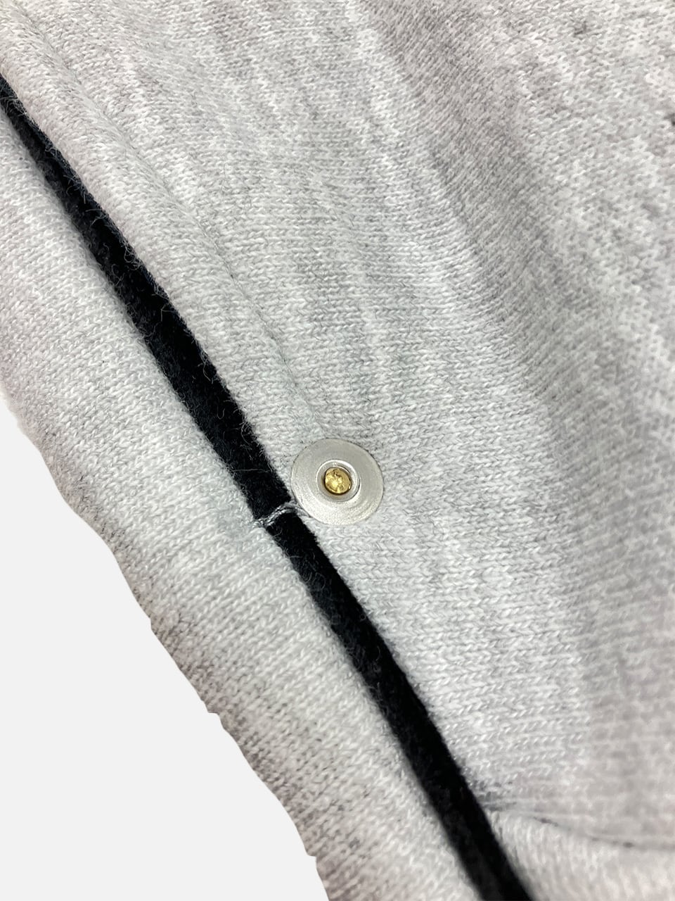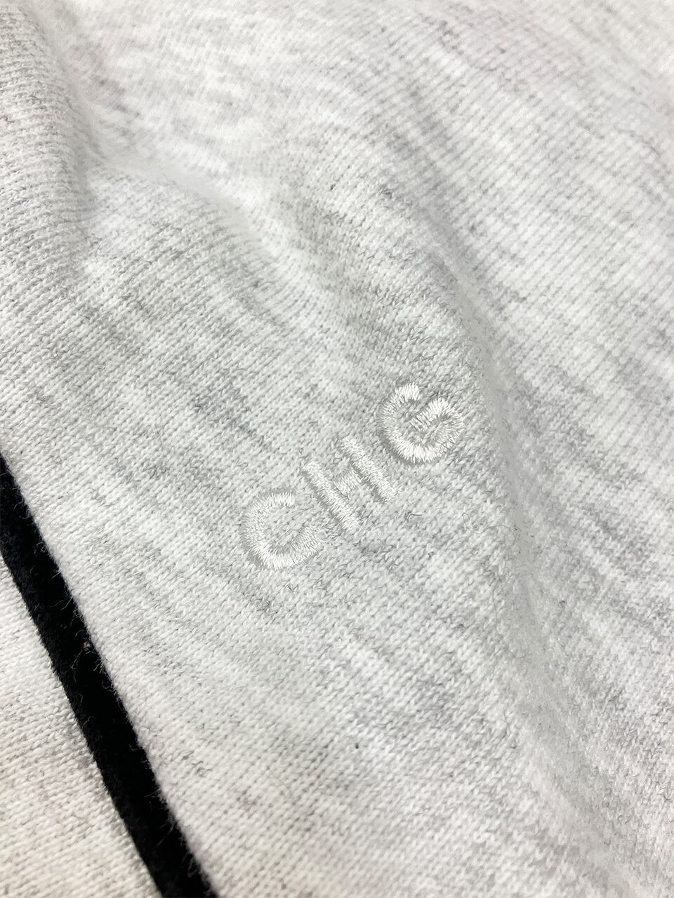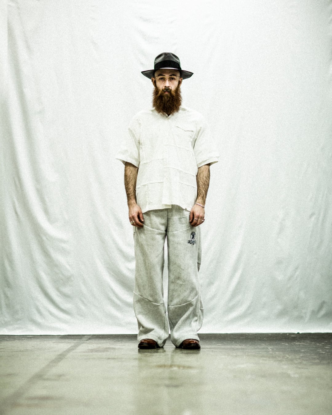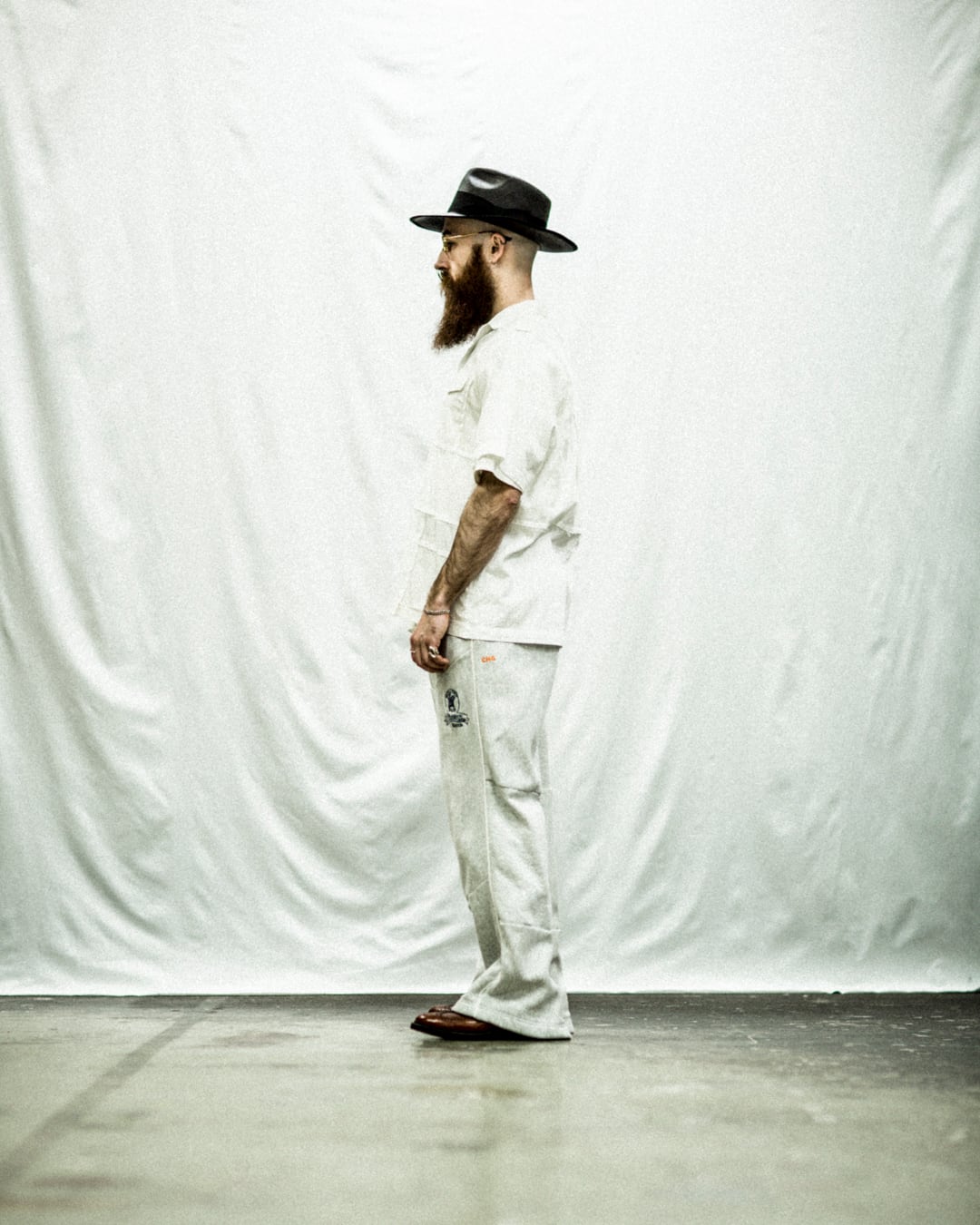 スウェットのフロント刺繍部分をパンツの前・後脇部分に移植して刺繍ロゴが配置されたデザイン